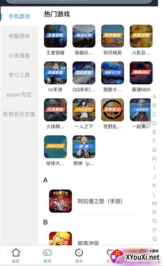 3. 进入平台,您将看到众多热门游戏,丰富的租号服务满足您的多样化需求。
