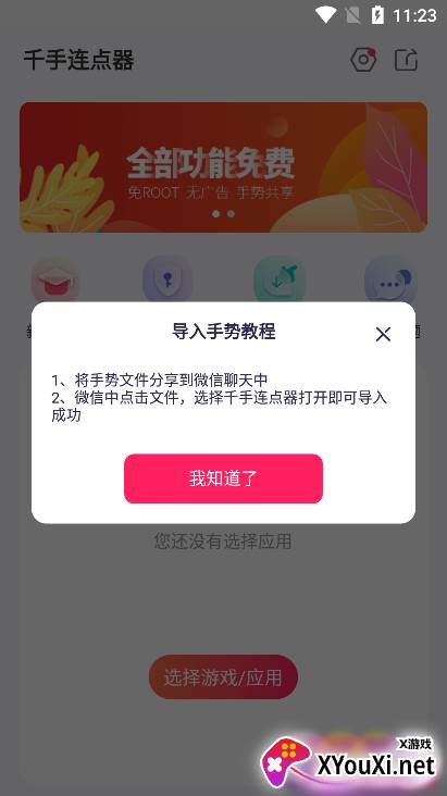 当你在微信等平台收到朋友分享的“.bin”手势文件时,只需选择用“千手连点器”打开,即可轻松导入并使用。