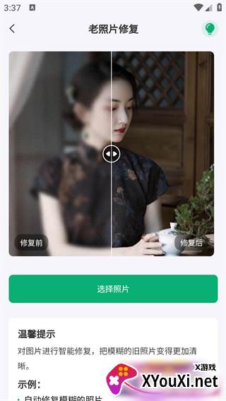 - 点击“老照片修复”选项,选择您想要修复的照片,便可轻松实现一键修复,让模糊的照片重现清晰。