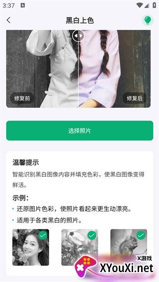 - 对于色彩的渴望,点击“黑白上色”功能,为您的黑白老照片注入生机,一键为场景与人物添加逼真的色彩。