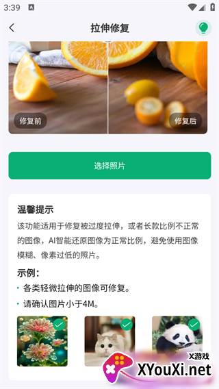 - 对于那些被过度拉伸或比例失调的照片,“拉伸修复”功能运用AI智能,将其还原至正常比例,避免模糊和像素损失。