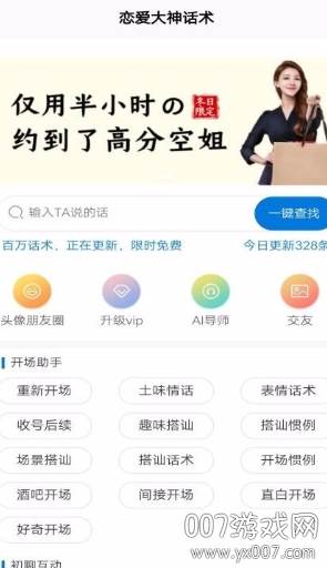 厌倦了“不知道怎么聊”的窘境?想从聊天小白变身情场高手?“恋爱大神VIP精选版”就是你的秘密武器!它是一款专为提升聊天技巧而生的应用。有了它,你将告别词穷,成为朋友圈里那个被女友称赞的情场达人。这款软件,让你轻松掌握撩动人心的开场白,从此开启你的情圣之路,赶紧来体验,成为那个万人迷!