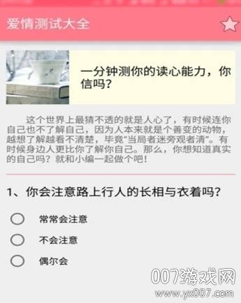 迷茫于生活的方向?渴望洞悉内心深处的秘密,抑或读懂爱人的心声?《爱情测试大全精华版》就是你寻觅答案的钥匙。它不仅涵盖了心理、情感、家庭婚姻、个性、工作学习、能力以及两性关系等多元化的测试领域,还提供心理FM在线播放,让你在测评诊断中豁然开朗,更深刻地认识自我。