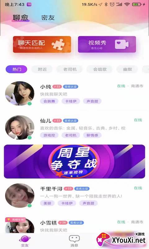 这款App凭借其智能大数据匹配,一分钟即可为你推荐默契度高达99%的异性,告别大海捞针式的茫茫人海。在这里,你可以自由挑选系统每日推荐的缘分,只需指尖轻扫,就能表达你的心意。更棒的是,支持多人语音连麦开房,与三五好友畅聊至天明,分享生活的点滴,释放内心的欢愉。