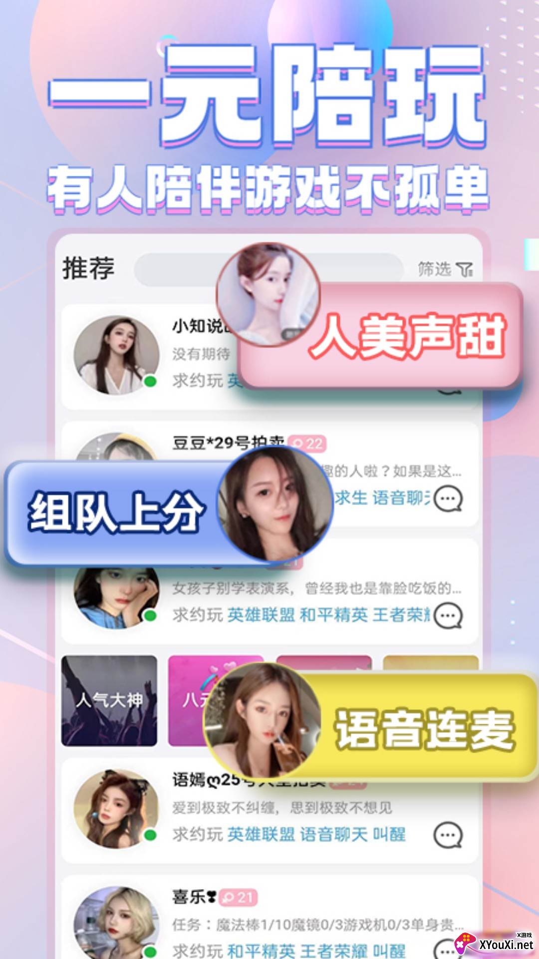 - 优质社交,畅聊无阻: 这是一个高品质的线上陪玩社交平台,让你轻松结识新朋友,分享游戏心得,畅聊生活点滴。