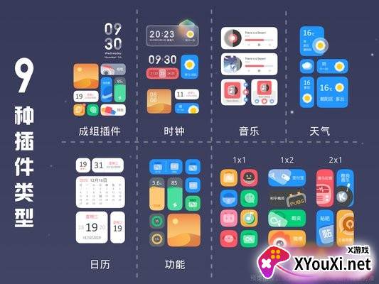 - 成组插件 (G1): 预设精美布局,尺寸7*4,适合占据一整页桌面,带来沉浸式视觉体验。