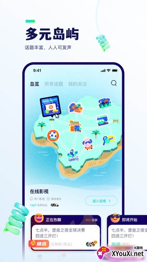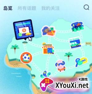 3. 兴趣小组(岛屿): 涵盖影视、音乐、美食、情感、旅行、悬疑等九大领域,海量奇趣话题库,等你来探索。