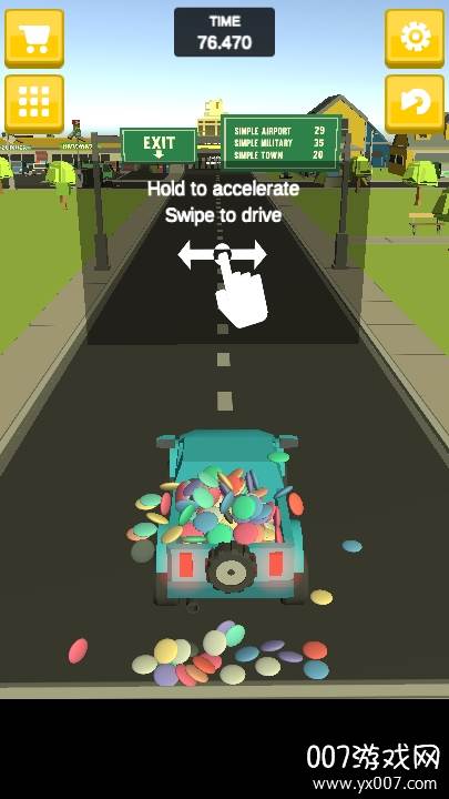 3. 在卡车上享受这场糖果运输之旅吧!轻触并按住即可加速,拖动屏幕进行操控。
