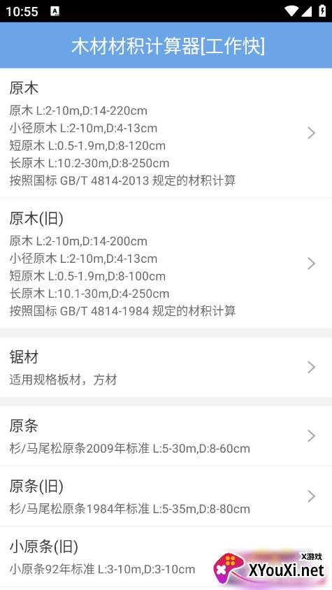 2. 打开应用后,根据您的计算需求,选择“原木”或“原木(旧)”等选项。您还可以下拉菜单浏览更多分类数据。