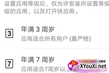 3. 在应用等级页面,您可以根据孩子的年龄,选择“3周岁”、“7周岁”或“18周岁”等不同等级。