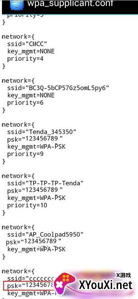 步骤五:打开 `wpa_supplicant.conf` 文件。查找 `ssid=”ccccccccc”` 确认WiFi名称,而 `psk=”123456789″` 则显示了该WiFi的共享密码。