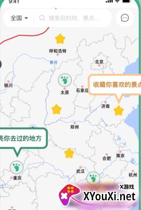 2、**首页地图全景呈现**:集旅游地图、地图范围选择、地点信息展示、地点收藏及足迹打卡于一体,一站式掌控您的出行地图。