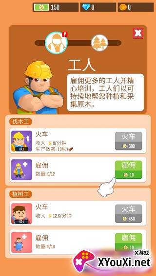 2. 扩大队伍,精细培养您的员工,他们将成为您可持续种植与采集原木的可靠力量。游戏中,伐木工与植树工各司其职,且雇佣成本各异。不妨先从一名伐木工开始,感受初创的脉搏。