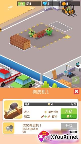 5. 瞧那堆积如山的木材!点击您的剥皮机,进行升级,提升处理效率。