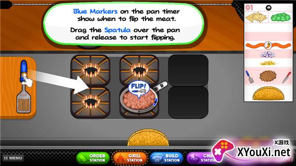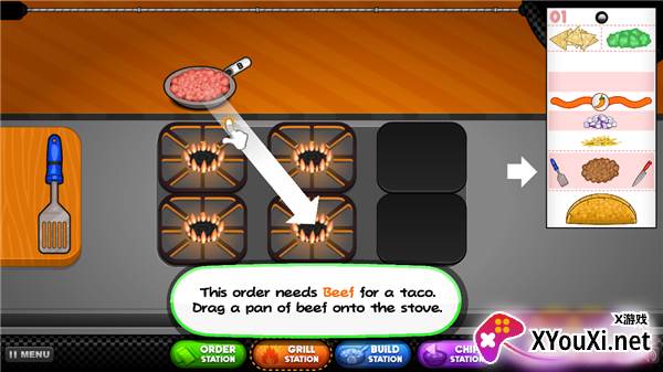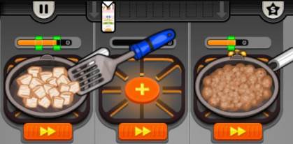 7、根据左上角的顾客食材清单,将相应的食材从锅中拖拽至灶台,开始烹制。